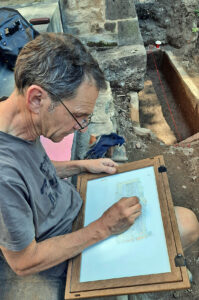 <= Neben dem Fotografieren und Vermessen der Fundstelle gehört auch das Zeichnen der Funde zur archäologischen Dokumentation