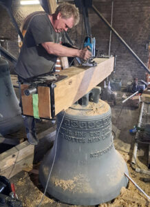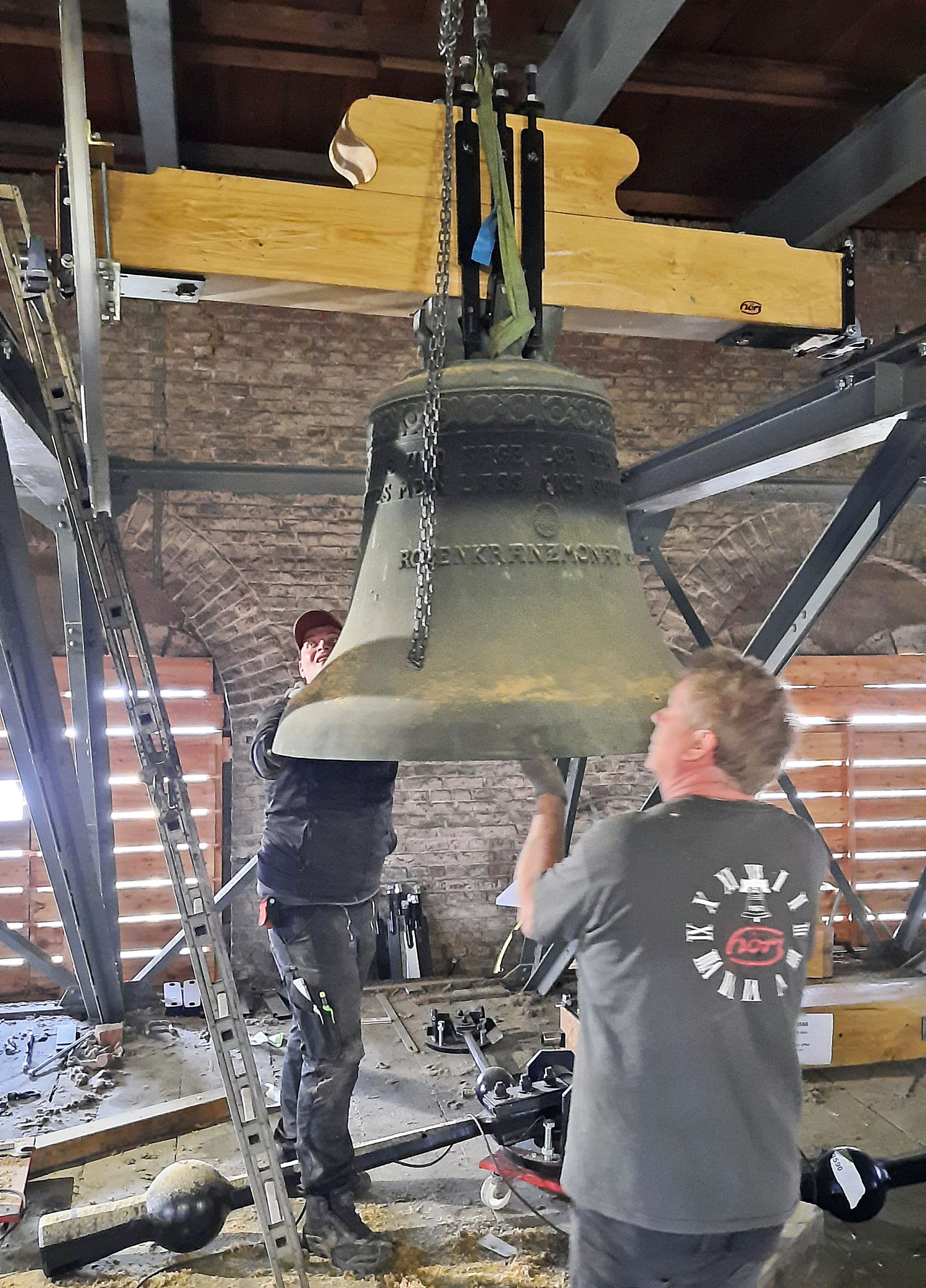 Oben angekommen zogen die beiden Monteure der Philipp Hörz GmbH die einzelnen Teile mittels Flaschenzügen in die Glockenstube. Dabei musste ein Höhenunterschied von 60 cm bis auf die Arbeitsbühne des Glockenstuhls überwunden werden. Mit das schwerste Teil war der neue Klöppel für die große Glocke in der Stimmung B mit gut 140 Kilogramm.