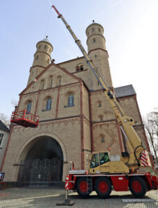 Um die Joche und sonstigen Halterungen auszubauen, wurden die Glocken zunächst mit Flaschenzügen angehoben und danach auf Kanthölzer abgesetzt. Für den Materialtransport wurden in einer der auf den Vorplatz hinausgehenden Luken die Bretter der Schallläden entfernt. So konnte ein Materialkorb, angehoben von einem Teleskopkran, dort mit seiner Laderampe „andocken“.